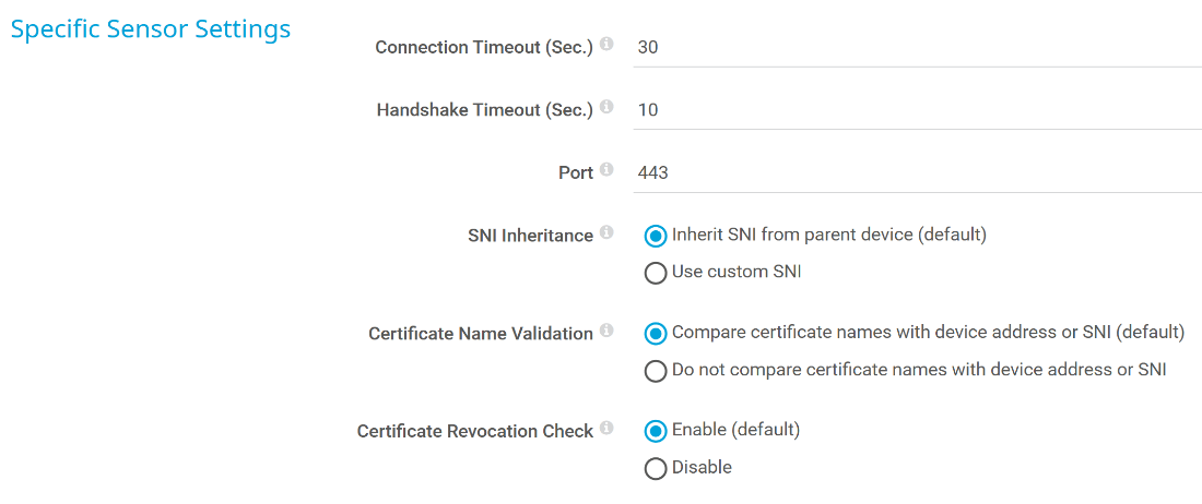 • Use custom SNI: Use this setting if the device that the sensor queries has multiple certificates with the same IP address and port combination.